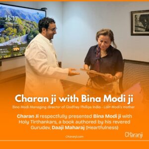 On this blessed occasion, Charan ji respectfully presented Bina Modi ji with the sacred book “Tirthankar”, authored by his revered Gurudev Daaji Maharaj (Heartfulness). The moment was filled with humility, reverence, and a shared spiritual connection.