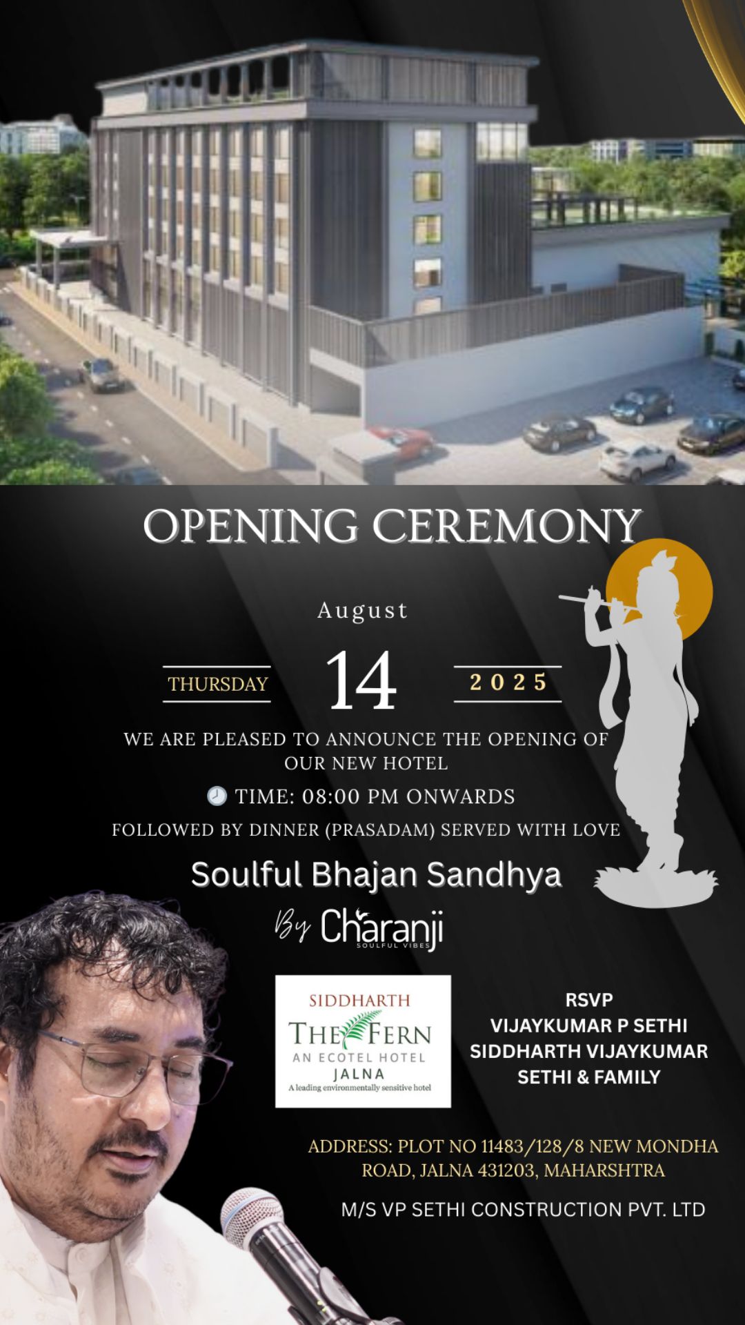कृष्ण जन्माष्टमी – जालना के पहले फाइव स्टार होटल ‘सिद्धार्थ द फर्न’ का भव्य उद्घाटन भजन गायक चरन जी के पावन भजनों के साथ हुआ।